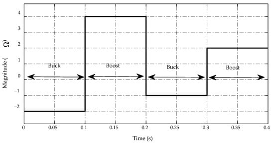 Figure 14a,b describe the estimated results of the state and mismatched disturbance using the ESO, respectively. In particular, the estimated state shows the high tracking accuracy of the real state during the steady-state period and when the converter switches between buck and boost modes at as shown in Figure 14a. As revealed in Figure 14b, the proposed observer ensures the estimated error of the mismatched disturbance converges to zero under the steady-state working conditions. However, there is still a small estimation error of this mismatched disturbance when mode switching occurs at as shown in Figure 14b.