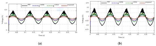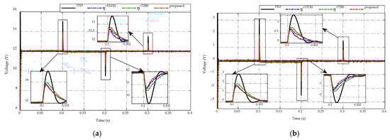 For the high-voltage side response, the voltage variations under the buck/boost mode switching of four control strategies are shown in Figure 12 in which Figure 12a depicts the voltage-tracking performances, while Figure 12b presents the corresponding comparative tracking error. Keeping the desired voltage at 24 V is the main requirement on the low side. Overall, a small fluctuation in the range of keeps the high-side voltage around the desired value. In particular, when the converter operates in the buck mode during the time and , the battery source will discharge the energy to satisfy load demand, causing a slight degradation of the high-voltage side compared to the desired voltage with the tracking error in the range of as shown in Figure 12b. Meanwhile, the converter works in the boost mode, which controls the charging energy to the battery source, in the interval of and . As a result, the high-voltage side fluctuates with the tracking error in the range of .