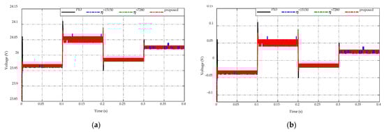 Figure 17 presents the output voltage response of the proposed adaptive scheme, the PID control, and the other two constant switching gains for regulating the output voltage to achieve the desired value at 12 V. It is seen from Figure 17a, the proposed adaptive strategy maintains the output voltage with the least amount of ripple. Meanwhile, constant switching gains show a higher ripple magnitude than the adaptive scheme, and the PID control has the largest output voltage ripple, which affects the output voltage quality of the DC/DC converter. In Figure 17b, the comparative error efforts of four strategies are described. As can be seen, the proposed control strategy achieves the highest tracking accuracy of desired output voltage with the error approximated at V. The PID controller, on the other hand, takes the least tracking accuracy with the error in the range of V, while two constant switching gains obtain greater output voltage adaptation with the tracking error in the range of V and V for and , respectively.