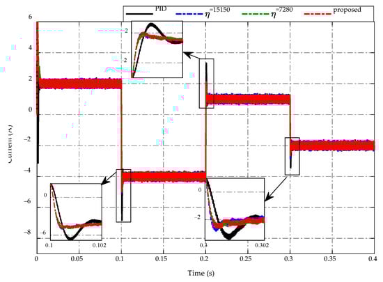 In this case study, comparative results are presented to demonstrate the performance of four control strategies under the input voltage variation. In comparison to the proposed control strategy, the PID control and two constant switching gains are used, with being the lowest switching gain and being the highest switching gain. The simulation results of input voltage variation are shown in Figure 17, Figure 18, Figure 19 and Figure 20.