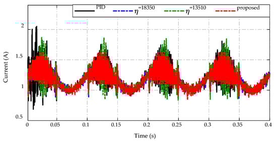 The inductor currents of the proposed strategy and others are described in Figure 18. It can be observed that the inductor current shows higher ripple amplitude than other strategies when using the PID controller and constant switching gain with the current fluctuating from 0.7 A to 2 A. Meanwhile, the proposed strategy and constant switching gain achieve the improvement of inductor current ripple in the range of (0.9–1.6) A under conditions of input voltage variation.