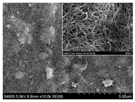 SEM image of multiwalled carbon nanotube–modified glassy carbon electrode (MWCNTs/GCE). A zoomed-in area is shown in the inset.