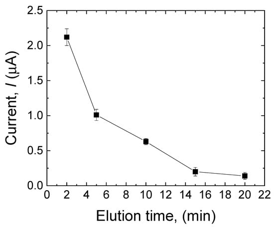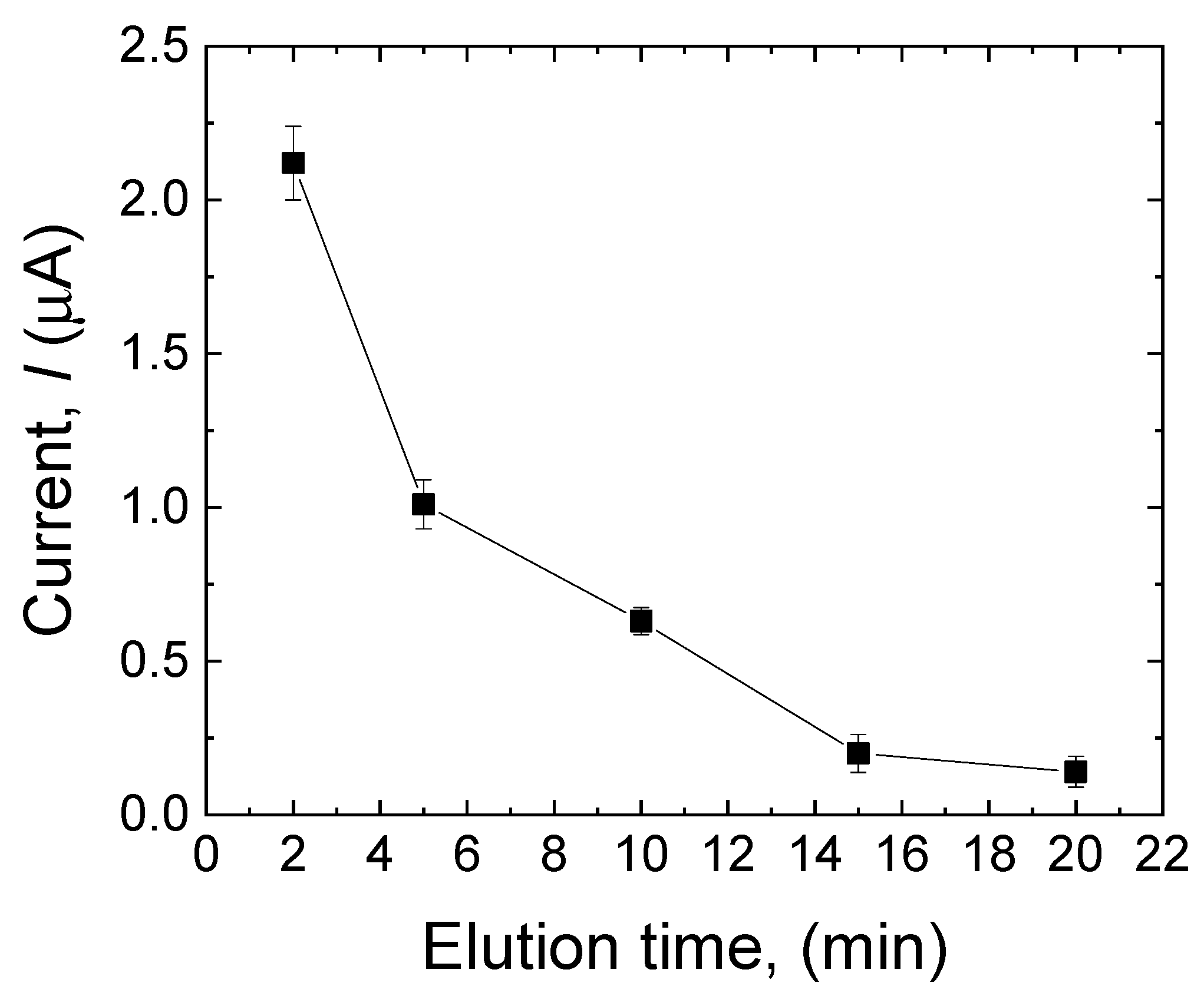 Effect of elution time (2 min, 5 min, 10 min, 15 min, and 20 min) on the current response of the sensor to MDA in the MIP layer. Error bars are calculated from three independent replicates.