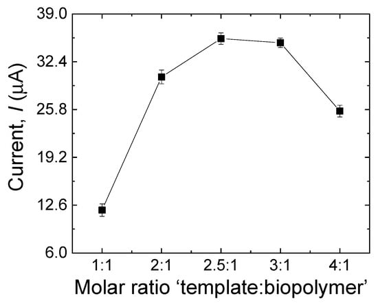 Effect of the template–biopolymer molar ratio during the electropolymerization process on the current response of the sensor to MDA (500 µM). Error bars are calculated from three independent replicates.