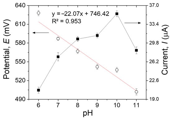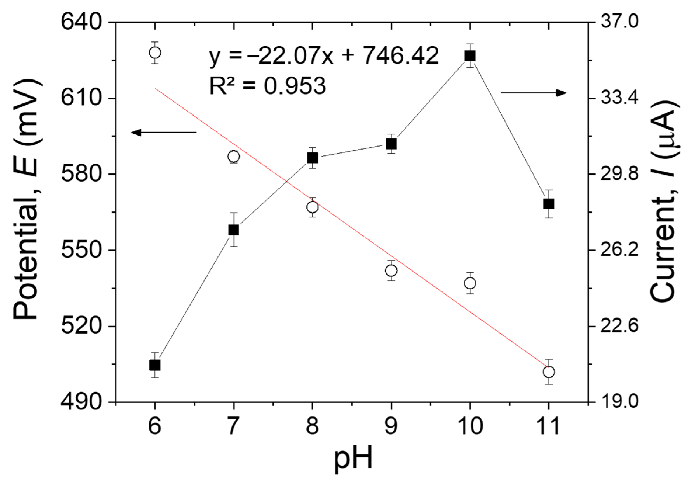 One of the most important parameters on the performance of the MIP sensors is the pH, not only because it influences the oxidation rate but also because it may affect both the shape of the target molecules and the function and structure of the imprinted polymer []. The impact of the pH on the peak potential (Epa) and peak current (Ipa) was investigated by DPV using 500 µM of MDA in the pH range of 6-11 (Figure 8). As the pH increased from 6 to 10, the peak current of the imprinted sensor increased progressively. Conversely, when the pH changed from 10 to 11, the peak current declined, probably because of the impact of the high pH on the oxidation of MDA on the surface of the modified electrode []. Hence, the B-R buffer solution with pH 10.0 was selected as the best electrolyte to achieve the best sensitivity in all the measurements. The linear relationship between Epa and pH can be expressed by the following equation: Epa (V) = −22.07 pH + 746.42. The potential negatively shifts by 22.07 mV per pH unit, demonstrating that one proton every two electrons was involved in the electrochemical reaction [].