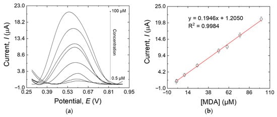 (a) DPV responses of the MIP/MWCNTs/GCE at different MDA concentrations: 0.5, 1, 10, 10, 25, 50, 60, 75, and 100 µM; (b) the calibration line of the response peak current versus the MDA concentration. Error bars are calculated from three independent replicates.