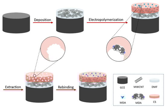 Molecular imprinting is a well-established and simple method to fabricate materials with recognition sites with complementarities in size, shape, and functional groups with the template molecule. MIP materials can mimic natural receptor systems (antibodies, enzymes, and hormones) to bind with a specific target analyte [,]. The main steps for MIPs synthesis are as follows: (1) a combination of template molecules with the functional monomers to make a composite via noncovalent bonds or covalent in solution; (2) polymerizing the complex with initiators and cross-linkers under photo-/thermal conditions; (3) a template removing the use of solvent elution because the analyte has higher solubility in the solvent []. MIPs can bind specifically to the original and related template molecules while also possessing tolerance to mechanical stress, temperature, pH, etc. []. MIP materials have attracted much attention in recent years because of their great potential for electrochemical applications. In particular, MIPs can advantageously be used as functionalized polymers for making more-sensitive and more-selective electrochemical sensors [,,].