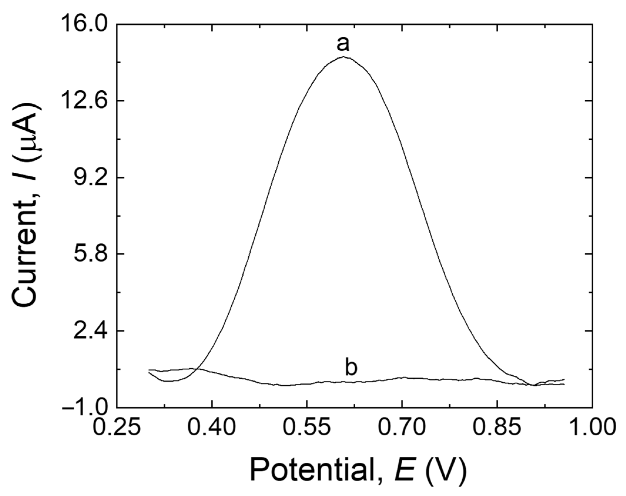 Figure 2 shows the DPV responses of the MIP/MWCNTs/GCE with and without the template. An obvious current peak was detected in the presence of the template encased in the main biopolymer network (trace a). However, no peak was observed when the MIP/MWCNTs/GCE was eluted with a solution of ethanol and NaOH (trace b). This demonstrated that the ethanol-NaOH solution is an efficient solvent for extracting MDA, thus generating the final MIP structure.
