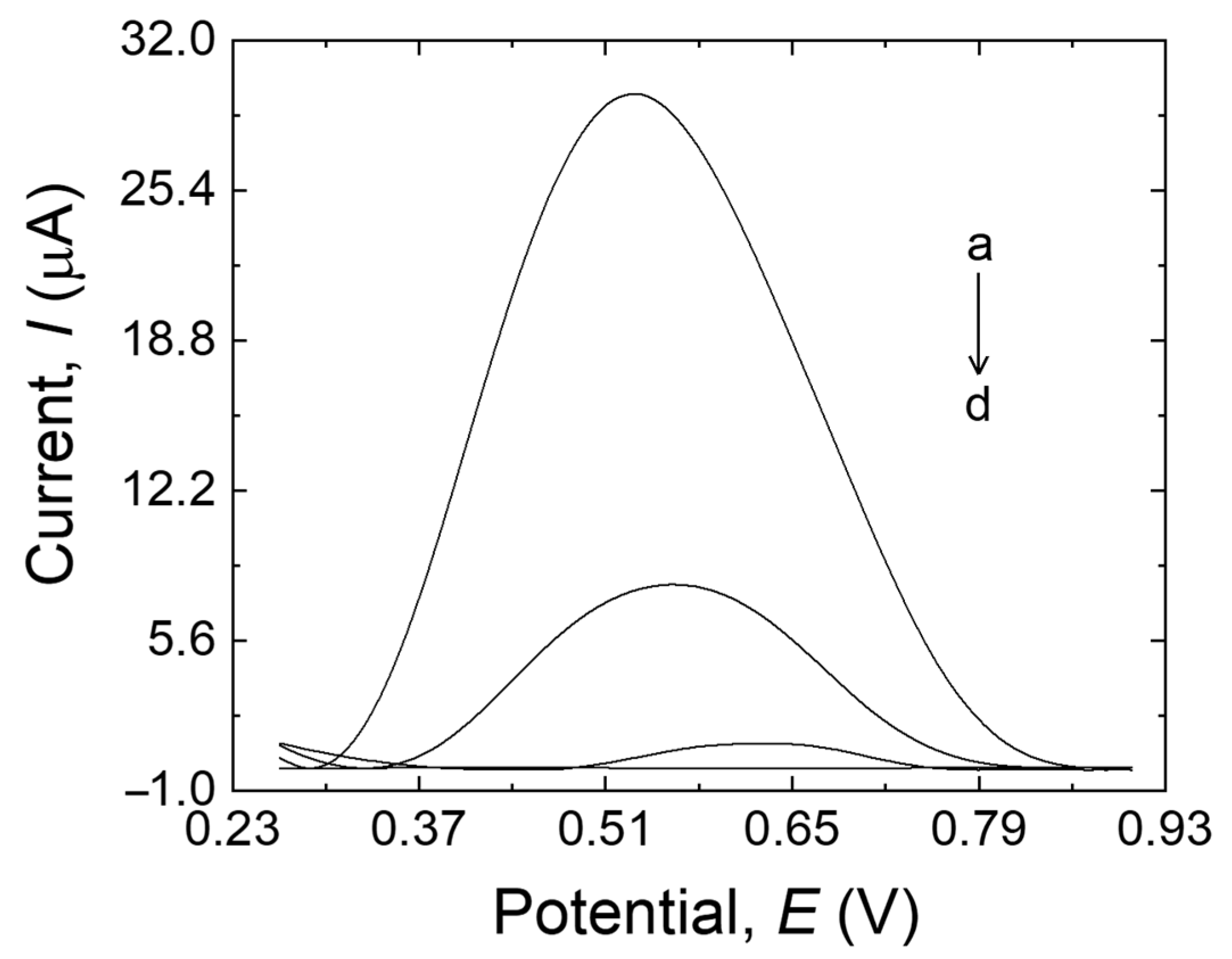 The electrochemical behavior of MDA at the surface of MIP/MWCNTs/GCE (a), NIP/MWCNTs/GCE (b), MIP/GCE (c), and bare electrode (d) was investigated by DPV, as shown in Figure 3. The peak current at the modified/unmodified GCE varied according to the following order: MIP/GCE < bare electrode < NIP/MWCNTs/GCE < MIP/MWCNTs/GCE. The bare electrode showed a peak with a higher current than MIP/GCE (trace c–d, Figure 3), which can be explained by the fouling that occurred during the electropolymerization on the surface of the bare electrode as well as by the low sensitivity of the bare electrode, possibly due to the low surface area of the electrode. NIP/MWCNTs/GCE (trace b, Figure 3) showed a higher peak current than the electrodes discussed before. This could be attributed to the antifouling effect of MWCNTs and also to the high conductivity and surface area of the nanotubes, which can result in increased sensitivity to the sensor. Furthermore, the peak current at the MIP/MWCNTs/GCE (trace a, Figure 3) is higher than the others, which suggests that MDA molecules have been extracted from the MIP structure and that the cavities were correctly made in the MIP structure. The MIP’s nanoporous structure made it easier for MDA molecules to move to the electrode’s surface, accelerating the oxidation of the analyte and boosting its detection. These results demonstrate that MWCNTs can amplify the response signal while using the imprinting process to identify MDA. The electrocatalytic oxidation characteristics of MDA at various electrode surfaces at pH 10.0 are summarized in Table 1.