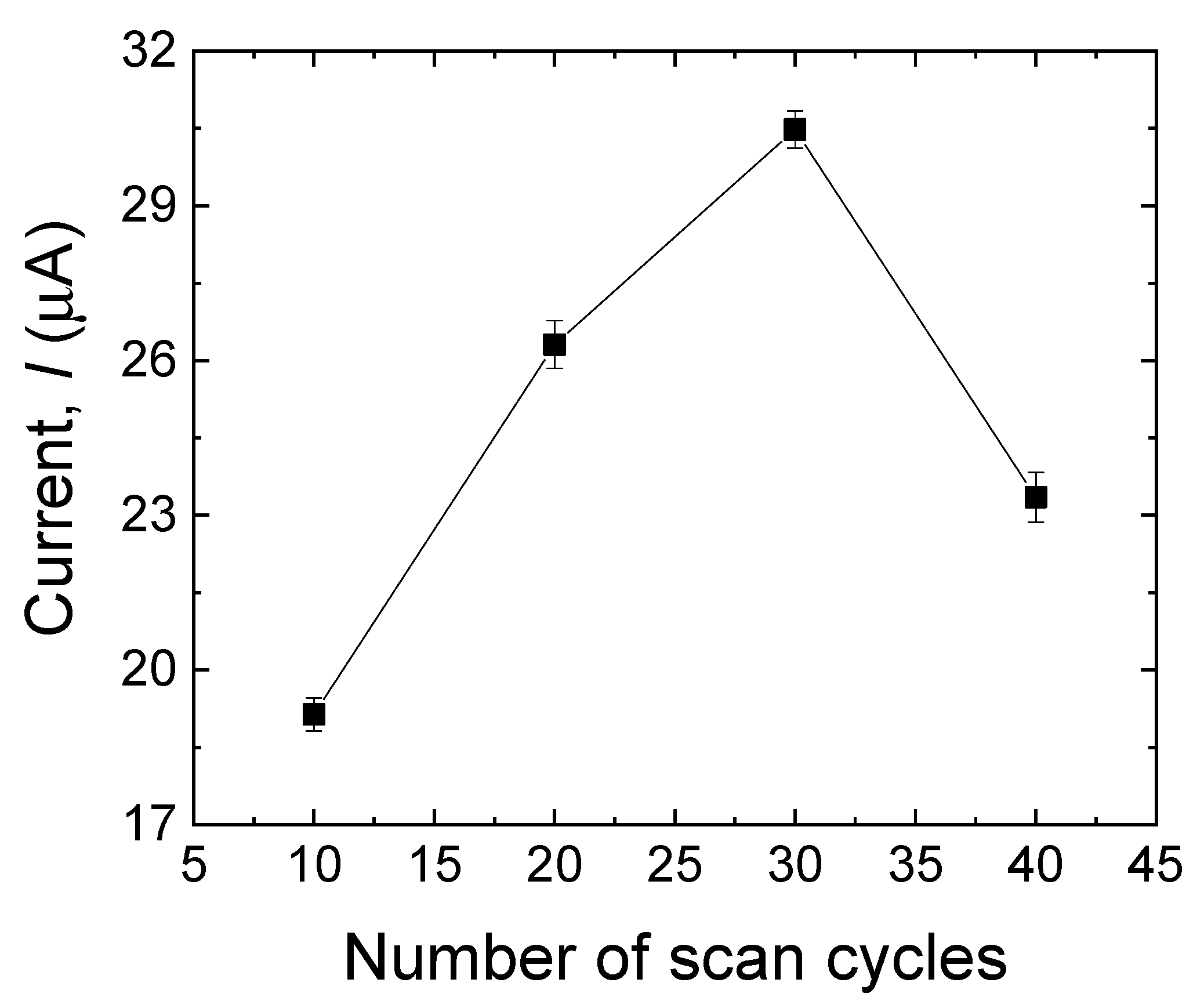 One of the most important factors that should be considered while dealing with MIPs is the film thickness []. More specifically, in the case of very thin imprinted membranes, the main drawback is associated with the low number of imprinted sites that can be formed on the surface of the electrode, which may result in low sensitivity in the sensor. On the other hand, when the imprinted layer is excessively thick, the sensor may have limited sensitivity, which could be because of two main reasons: (i) it is almost impossible to remove the template molecules that are located in the bulk of the membrane; (ii) the high mass-transfer resistance, accessing the imprinted sites located in the bulk of the membrane is hard for the target analyte. The simplest way to control the polymer membrane’s thickness is to monitor the number of scan cycles throughout the electropolymerization process []. In this work, various scanning cycles (10, 20, 30, and 40) were used for the electrodeposition process to control the thickness of the imprinted film. As shown in Figure 4, the peak current response of the MIP sensor toward MDA increased with the cycle numbers, reaching its maximum: 30 cycles. The steeping part of the plot is plausibly due to the progressive increase in the MDA-binding sites, whereas the descending part of the plot might be due to the thick sensing layer with fewer available imprinted sites. Because the peak current response reached its maximum at 30 scanning cycles, this setup was selected to obtain the best performance of the MIP layer [,].