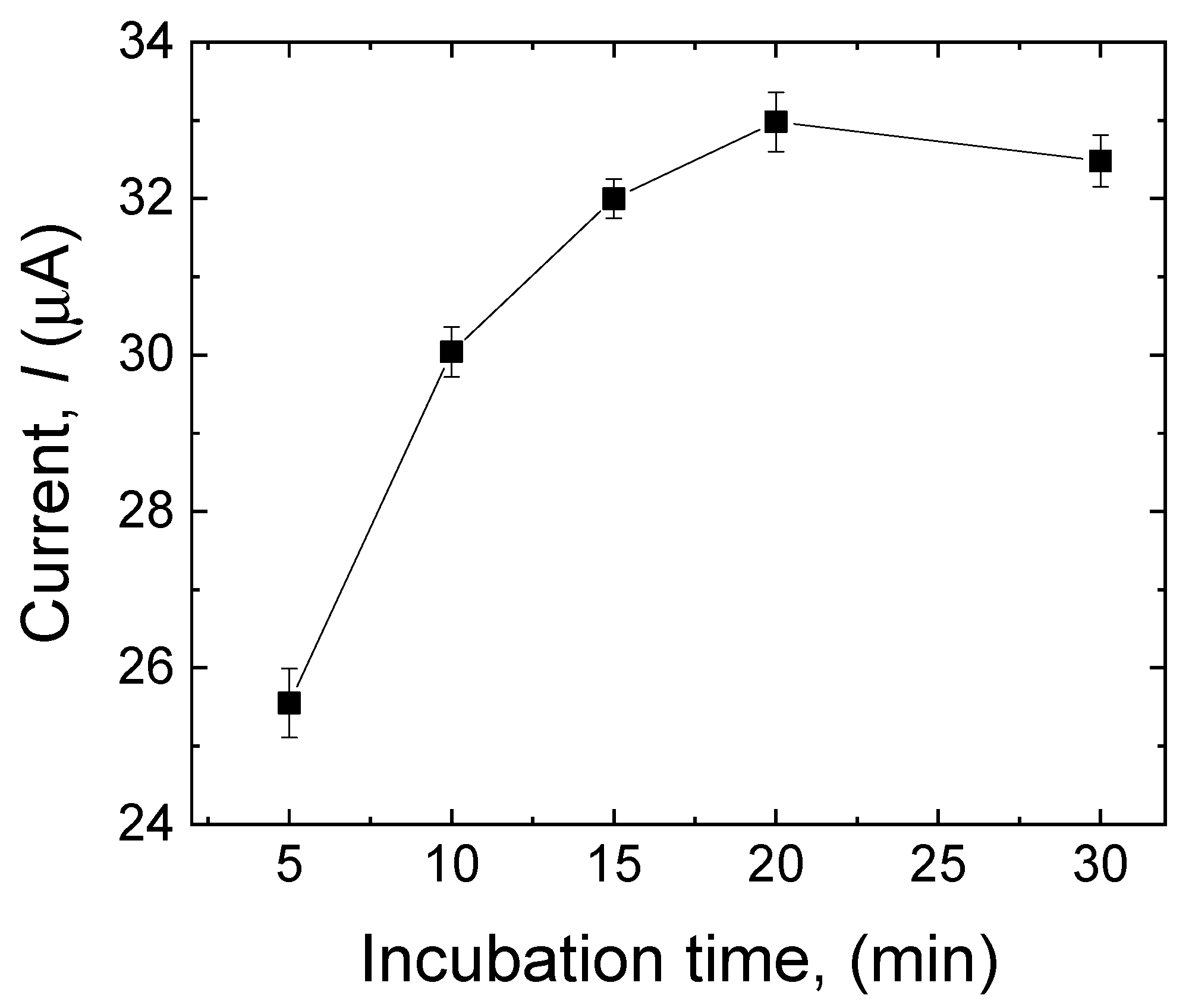 Effect of incubation time (5 min, 10 min, 15 min, 20 min, and 30 min) on the current response of the sensor to MDA (500 µM). Error bars are calculated from three independent replicates.