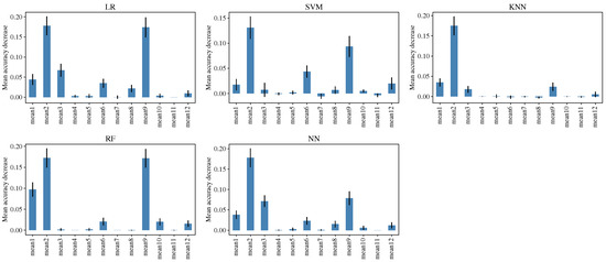 A sensitivity analysis was conducted to examine the impact of each feature on the performance of the models. The analysis was performed through the permutation of the feature values by using the function permutation_importance of the scikit-learn library. The feature importance for each ML model is shown in the plots of Figure 3; for most models, the most important features are the mean value of Mel coefficients 1, 2, 9 and in lesser proportion 3, 6, 12. Furthermore, there are features with a minimum effect, such as the mean value of Mel coefficients 4 and 11.