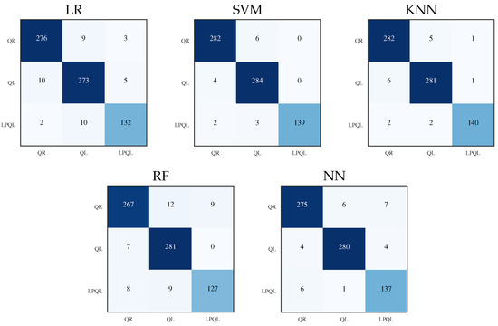 The CM and their performance metrics were computed in the process of eight-fold cross-validation; every fold consists of 90 samples; 36 samples for QR colonies, 36 samples for QL colonies, and 18 samples of LPQL colonies. The accumulated samples for the eight-fold cross-validation are 288 for QR colonies, 288 for QL colonies, and 144 for LPQL. The results of every fold are summarized in a single CM for each ML model, as shown in Figure 4. The elements in the main diagonal represent the TP values for their respective class. For QR colony classes, the TP value is the first cell of the matrix (1,1), the FN values correspond to cells (1,2) and (1,3), the FP values correspond to cells (2,1) and (3,1), and the TN values are the rest of the cells. For QL and LPQL classes, the corresponding TN, FN and FP values must be reassigned.