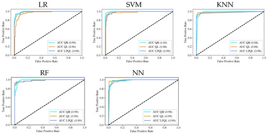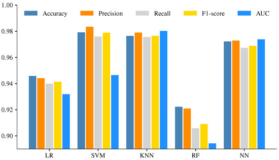 The SVM and LR models were initially developed for binary classification tasks; in order to deal with multiclass problems, the ML models are analyzed under the OvA schema by the scikit-learn library. On the other hand, NN, RF, and KNN models can support native multiclass classification tasks; however, RF can achieve higher prediction performance when the problems are analyzed with the OvA scheme [51].