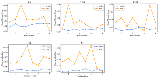 Using the k-fold cross validation, the mean absolute error was calculated in every fold to verify overfitting in the ML models. In Figure 7 mean absolute error is plotted against the number of folds, and it can be noted that the training error is low (about 0.02) for all models except for LR. However, the test error presents more variations; the maximum error in RF and LR can be found in values around 0.12 and, for the rest of the models, around 0.08. Nevertheless, the plots do not present huge variations of error; therefore, it can be concluded that the models do not present overfitting.