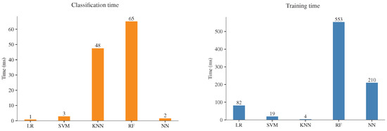 Finally, as a form to evaluate the computational cost, the time required to classify the samples and train the models was measured by using the library time in Python. The training time is the time required to train an ML model; the classification time is the time required to classify the test dataset. The execution time considers the single line of code where training and classification take place, meaning that the feature extraction, preprocessing, and dataset splitting are out of the measurements. The training time was measured by using the 70% of the dataset (504 samples) and the classification time of the rest of the dataset (216 samples). As mentioned previously, the experiments of time execution were carried out on an RPi 3 computer; moreover, to take advantage of the device resources, the computer was run with no graphical desktop and no other application running at the same time. It is important to note that the implementation of ML models only uses one core of the processor of the four available. The experiments for every ML model were repeated ten times, and the results were summarized with the mean value, Figure 8. Most of the models are executed in very short times; this was achieved by computing the mean value of the MFCCs; without this step, this process takes more time on a regular PC. The results highlight significant differences; RF is the model that requires more training time, followed by NN and LR; on the other hand, SVM and KNN models require the shortest training times, which is essential if the model needs to be trained in the monitor system. This task is fast even in the slower ML model, but the increase of the dataset will be necessary to generalize between colonies and status health. At this point, the dataset size is limited due to the difficulty of obtaining new samples; however, increasing the dataset size will require more training time, and the execution time difference will be noticeable. The classification time is the most critical measure; this task will be performed several times to recognize the colony state and will be one of the most consuming resource processes in a monitor system. The results, Figure 8, show that RF and KNN are the models that require more time to classify the samples. In this experiment, RF is the model that requires significant training and classification time. Finally, the faster classification time is achieved by SVM and NN, followed by LR.