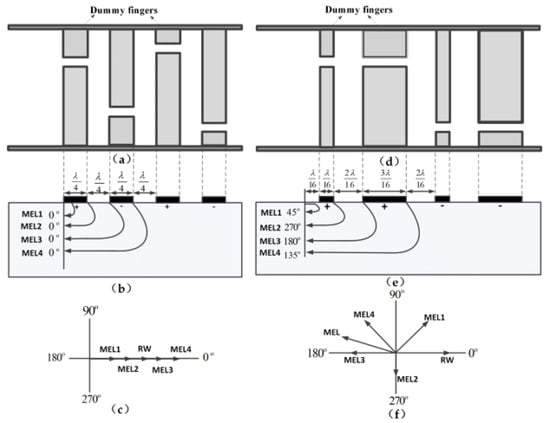 Figure 2. Electrode reflection of single electrodes IDTs and unbalanced-split-electrode IDTs. (a) Single electrodes IDTs; (b) Mass load (MEL) reflection of single electrodes IDTs; (c) Phase synthesis diagram of single electrodes IDTs; (d) Unbalanced-split electrodes IDTs; (e) Mass load (MEL) reflection of unbalanced-split electrodes IDTs; (f) Phase synthesis diagram of unbalanced-split electrodes IDTs.