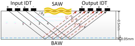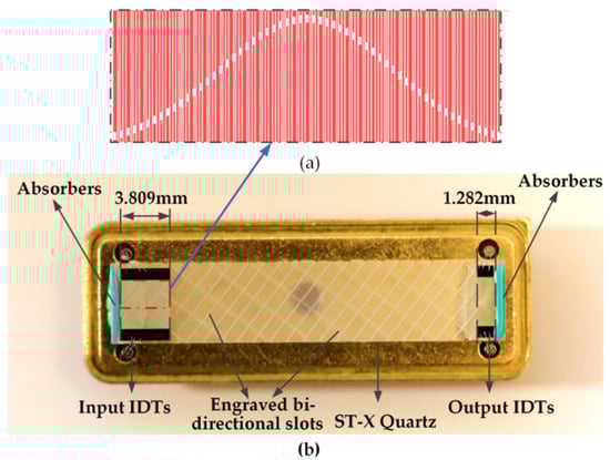 - The following measures are taken to minimize the second order of the surface acoustic wave devices. First, this is accomplished by reducing the electrode reflection by using the unbalanced-split electrode [17]. Second, this is accomplished by reducing the sound–electricity reclamation (SER) by choosing the ST-X quartz as the piezoelectric substrate [18]. Third, reducing the interference of bulk acoustic wave (BAW) by engraving bi-directional engraving slots of the piezoelectric substrate [19].