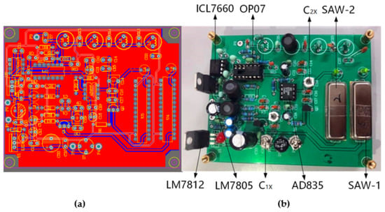 Diagram of the dual differential surface acoustic wave oscillator system. (a) The design of PCB. (b) The Circuit board.