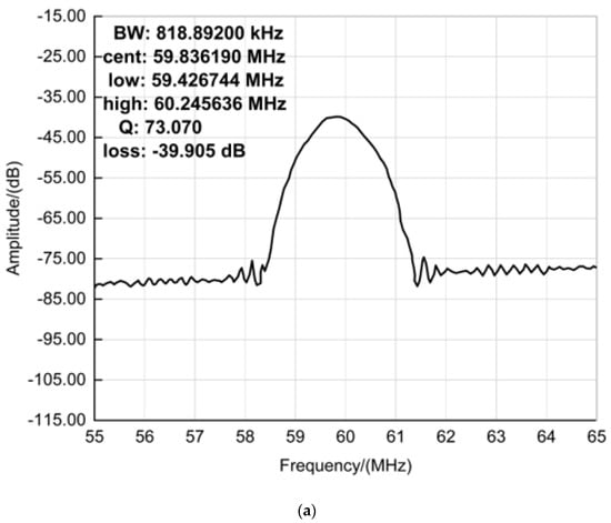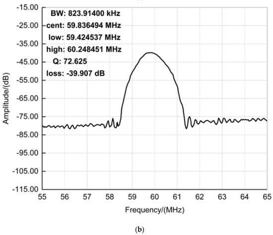 Agilent E5061A ENA-L radio frequency network analyzer was used to test the acoustic surface wave devices’ frequency response characteristics. The frequency response of a group of acoustic surface wave devices was measured, as shown in Figure 6. Figure 6a shows the frequency characteristics of SAW-1, whose centre frequency is 59.836190 MHz. Figure 6b shows the frequency characteristics of SAW-2, whose centre frequency is 59.836494 MHz.