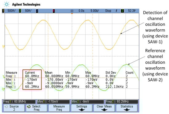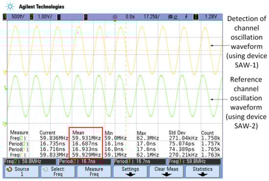 KEYSIGHT 4000X high-performance hybrid digital oscilloscope (4 channels 200 MHz) is used to test the frequency of SAW devices, and the oscillation waveform is shown in Figure 7. In Figure 7, the yellow curve is the detection channel’s waveform, and the green curve is the reference channel’s waveform. Since the circuit parameters of the two channels are the same, the oscillation frequency of both channels is 59.8 MHz (shown in the red box of Figure 7).