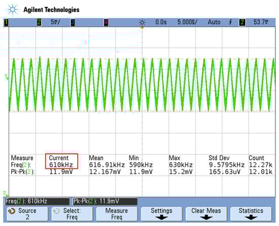 Figure 10 shows the output waveform after the second-order low-pass filter is passed. The difference frequency signal is a sine wave signal, and the oscillation frequency is 610 kHz (as shown in the red box in Figure 10), which is the difference frequency value of the two waveforms in Figure 8 (as shown in the red box). Therefore, the basic calibration value of the measured detection channel and reference channel . That is, , and Equation (10) can be changed to: