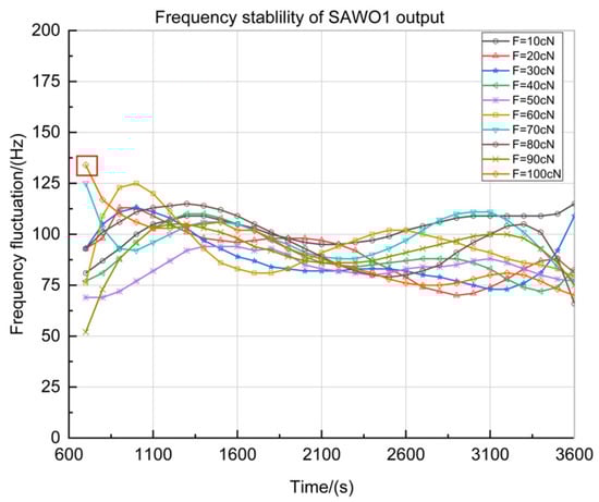 The output of SAWO1 with different tension from 0 to 100 cN is tested at intervals of 10 cN. A continuous test was carried out for one hour, and the frequency fluctuation was recorded between 600 s and 3600 s. As shown in Figure 11, ten groups of data ranging from 10 cN to 100 cN are obtained from 600 s to 3600 s.