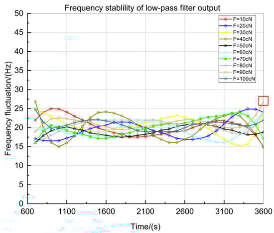 The output of low pass filter with different tension from 0 to 100 cN also is tested at intervals of 10 cN. A continuous test was carried out for one hour, and the frequency fluctuation was recorded between 600 s and 3600 s. As shown in Figure 12, ten groups of data ranging from 10 cN to 100 cN are obtained from 600 s to 3600 s.