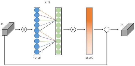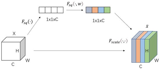 The Squeeze-and-Excitation Networks (SE-Net) attention mechanism is a mechanism for adding attention to the channel dimension, and the key operations are divided into squeeze and excitation. The model uses the importance level to assign a weight value to each feature, thus allowing the neural network to pay more attention to certain feature channels. Squeeze part (colorless plot of 1 × 1 × C in Figure 2) compresses each 2D feature (H*W) into one real number by averaging pooling layers, converting the feature map haste [h,w,c] into [1,1,c], while the excitation part (colorful plot of 1 × 1 × C in Figure 2) produces a weight to each feature channel, constructs the inter-channel correlation by two fully connected layers’ correlation, and the number of output weights is the same as the number of channels in the input feature map. In the scale part, the normalized weights obtained earlier are weighted to the features of each channel. The structure of the SE-Net model is shown in Figure 2.