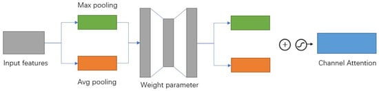 In the channel attention mechanism, the input feature maps are first subjected to global maximum pooling and global average pooling, respectively, to obtain two feature descriptions with different dimensions. After that, the number of channels is first dropped by a fully connected layer, and then recovered by another fully connected one. Finally, the weights of each channel of the sigmoid activation function feature map are normalized, and the normalized weights are multiplied with the input feature map to obtain the final realized channel attention (blue square in Figure 4).