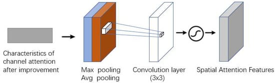 In Figure 5 spatial attention mechanism module, the input feature map is first conducted with maximum pooling and average pooling in the channel dimension, and the two feature maps after pooling are stacked in the channel dimension. Then, the feature map shape is changed from [b,2,h,w] to [b,1,h,w] by fusing the channel information using a 3 × 3 convolution kernel. Finally, the convolved result is normalized to the spatial weights of the feature map by the sigmoid function, and then the input feature map and the weights are multiplied together.
