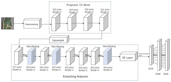 In this paper, we propose a neural network model CSBNet for crop pest and disease leaf classification. The model is divided into four parts: compression part, extracted features part, enhanced extracted features, and image classification. The original image, when it enters the network, needs to go through a preprocessing session first. After first performing a uniformized reconstruction of the pixel size, and then horizontal flip, after the normalization process, its value range is made to be between [0, 1]; this will speed up the convergence of the network, improving the robustness of data, and, also, give a better response to the processing of activation functions. Then, CS-Block is entered for compressed sampling, preventing under-sampling by up-sampling layers again, making the sampled data smaller than the size of the convolution kernel, and the resulting inability to perform subsequent convolution operations []. The corresponding features are extracted by entering the feature extraction layer, and then adding features to the feature map through the SE-Net layer; finally, the classification is conducted through the fully connected layer. The following subsections provide a detailed description of the model structure section. Figure 8 shows our proposed model.