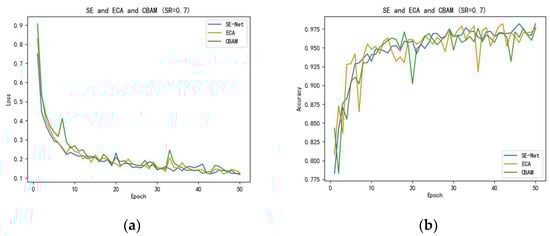 From Figure 10a, we can see that, when SE-Net is added, the curve of loss will be smoother and converge relatively fast, while ECA and CBAM are more oscillating and, finally, SE-Net has a lower loss. In Figure 10b, SE-Net has a higher accuracy curve.