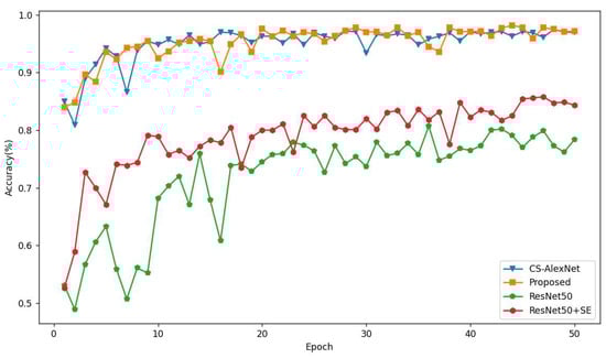 In this subsection, we compare and contrast the attention mechanisms under fixed SR. Comparing the classification performance of network models under different SR, each of these models incorporates our proposed CS-Block. The contrasting network models are: (1) CS-AlexNet model with CS-Block added, (2) our proposed network model, (3) ResNet50 network model with CS-Block added [], and (4) ResNet50-SE. After comparison, it is found that our proposed model obtains the best performance in terms of evaluation metrics.