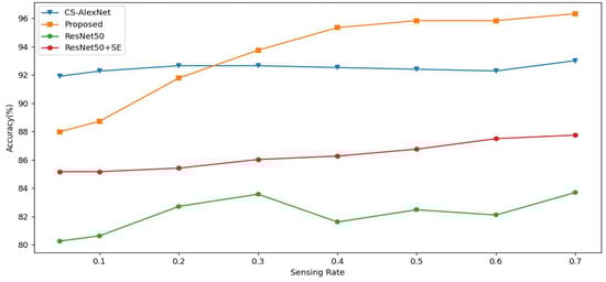 In Figure 12, when SR is taken as 0.7, our proposed model achieves 96.32% accuracy, which is higher than the 93.01% accuracy of the CS-AlexNet model without the attention channel, while ResNet50 and ResNet50-SE only achieve 80.27% and 87.75% accuracy, which is lower than the accuracy of our proposed model. The result curve of classification at the full sampling rate shows a positive trend with the sampling rate, and SR has a positive correlation with the accuracy of classification. This is in accordance with the logical relationship in traditional CS, i.e., when the SR value is taken as large, the better the reconstructed object is, and, when the SR value is taken as small, the effect is the opposite.