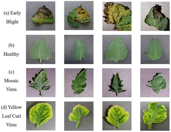 The model can be trained on different datasets to verify the robustness of the model. Therefore, we selected another dataset of pest and disease leaves, another dataset was selected on Plant Village for tomato pest and disease leaves, and four leaf categories are included: tomato early blight, tomato mosaic virus, tomato yellow leaf curl, and tomato healthy leaf. In this dataset, a training set of 1000 sheets for each category, a total of 4000 sheets are composed. The validation set consists of 200 sheets per class, composed of 800 sheets in total; this allows for a uniform distribution of training samples. The tomato dataset is shown in Figure 13.