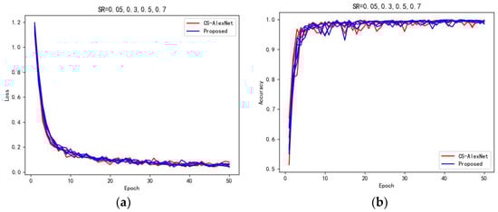 In the experiment, in a comparison using CS-AlexNet model and our proposed model, the values of SR are: 0.05, 0.1, 0.2, 0.3, 0.4, 0.5, 0.6, and 0.7, respectively. Figure 14 shows the comparison of epoch and loss values, and epoch and accuracy values when the SR values are 0.05, 0.3, 0.5, and 0.7, respectively. In Table 7, the highest accuracy of our proposed model reaches 88.13% and the average accuracy reached 82.13%; this is higher than the 81.73% accuracy of CS-AlexNet.