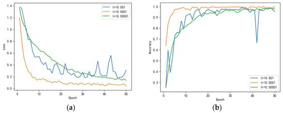 The learning rate exists as a very important parameter in the training process of neural network models. The size of the learning rate affects the rapid convergence of the mode and when to converge to the minimum value. A suitable learning rate value allows the model to converge to a local minimum in a suitable amount of time; it is beneficial for our model training. Therefore, we selected three different values of the learning rate to conduct a comparison test in order to derive a more suitable learning rate value for our proposed model.