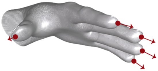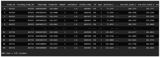 All the elements presented in Table A1 are derived from the model described above. As can be seen, regardless of elements that provide time information (timestamp, visible time), aspects such as speed, orientation, direction, normal and width of the palm are also considered (see Figure 5); identifiers of frame (id), hand and finger; distance and angles between fingers, and finally, widths, rotations, and joints of all the bones.