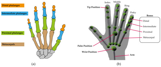 Tracking of the hands skeletal model (a) Object Bone. Source available online: https://developer-archive.leapmotion.com/documentation/javascript/devguide/Leap_Overview.html (accessed on 29 December 2022) (b) Object Hand. Source available online: https://ieeexplore.ieee.org/abstract/document/8538425/figures#figures (accessed on 29 December 2022).