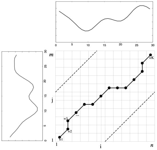 Example of a warping path. Source available online: https://blog.csdn.net/niyanghuahao/article/details/78612157?locationNum=9&fps=1. (accessed on 29 December 2022).