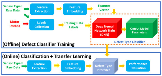 We show our proposed model in Figure 1 which has two modes: In offline training, the sensor with large amount of data (let us call it sensor type I) has its data entered to the feature extraction module that performs encoding and normalization of the input signals into numerical features. Second, a deep neural network (DNN) model is trained and tuned using these features and labels of the data (normal, near-failure or failure). We use the DNN as a multi-class classifier due to its discriminative power that is leveraged in different classification applications [52,53,54,55]. Moreover, DNN is useful for both tasks of learning the level of defect for the same sensor type and for transfer learning across the different sensor types that we consider here. In online mode, any new sensor data under test (here, sensor type II) would have the same feature extraction process where the saved feature encoders are shared. Then, the classifier (after retraining) predicts the defect type (one of the three states mentioned earlier) given the trained model, and giving as output the probability of each class.
