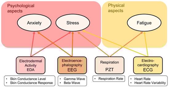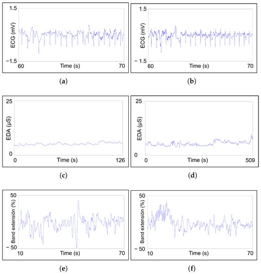 Regarding psychological aspects, anxiety is related to EEG and EDA signals. EEG measures brain electric activity, which can be indicative of concentration or relaxation states, and EDA values increase with the presence of anxiety [,]. Moreover, for stress detection, although the four bio-signals are used, the most important feature is EDA because of its relationship with the sympathetic nervous system (SNS), since this system acts as a trigger for stress. HR and respiration rate increase and EEG gamma waves appear with a stress state [,,,].