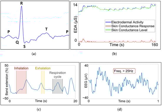 Measured bio-signals: (a) ECG with characteristic points: P, Q, R, S and T; (b) EDA with skin conductance response and skin conductance level components; (c) PZT signal with one inhalation, one exhalation and one complete respiration cycle highlighted; (d) gamma wave EEG signal, with a frequency higher than 25 Hz.
