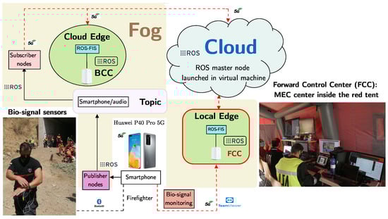 In this particular case, Fog and Cloud elements constitute the ROS-FIS. The smartphone takes part in the ROS-based sensor network, publishing audio recorded from its integrated microphone [] during a first responder intervention. The ROS master node hosted in the Cloud allows the MPC at the FCC to subscribe to the audio node published by the smartphone, obtaining the audio information. Likewise, the MPC at BCC can subscribe to the audio node too if desired. The smartphone also acts as an intermediate node between the BITalino board, which transmits via Bluetooth bio-signals recorded by physiological sensors on a SAR agent, and the FCC, where real-time bio-signals of the agent are displayed on a screen thanks to the 5G network and remote access software.