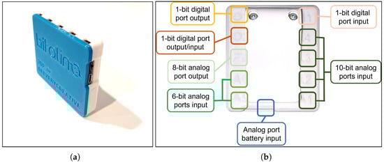 BITalino Core BT board: (a) assembled board for measuring bio-signals; (b) device ports where sensors and actuators can be connected.