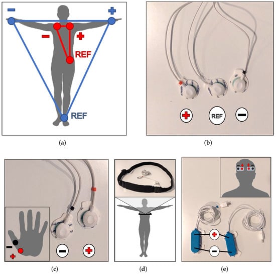 Sensor placement: (a) lead I Einthoven configuration; (b) ECG electrodes; (c) EDA electrodes and their placement on the palm; (d) PZT chest-band and its location around the chest; (e) EEG electrodes and their location on the forehead.