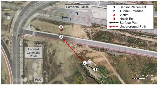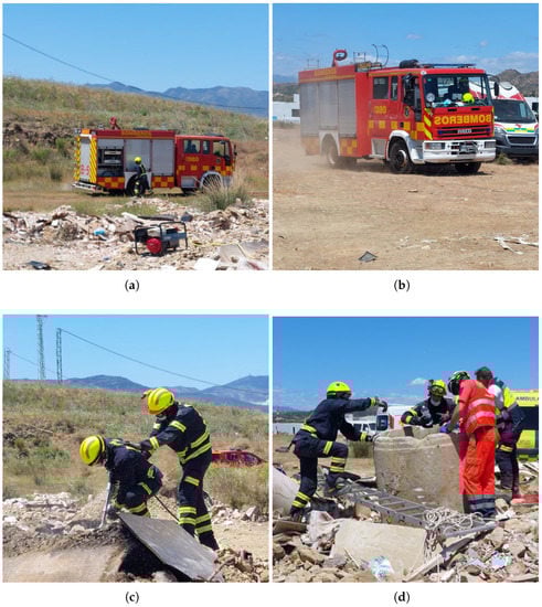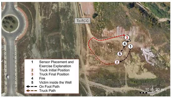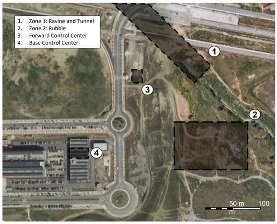 The exercises were conducted as part of an annual workshop organized by the chair of security, emergencies and disasters at Universidad de Málaga (UMA). Exercises were held in two different workshops, on 18 June 2021, and 3 June 2022, respectively. The purpose of the workshops is providing a framework for testing and evaluating new technologies under realistic conditions with the cooperation of members of governmental and non-governmental emergency response organizations. The exercise site was located within the UMA campus, in a 90,000 m plot called the area of experimentation in new technologies for emergencies (LAENTIEC). LAENTIEC was divided into several zones (see Figure 6). Although exercises were carried out in two different years, zones remained unchanged: