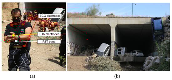 EDA electrodes were placed on the non-dominant hand of first responders, with the negative electrode (sensor black sleeve) located on the metacarpus of the thumb and the positive one (sensor red sleeve) put on the scaphoid, as shown in Figure 5c. This disposition was recommended by PLUX in the EDA sensor datasheet although electrodes can also be placed on other parts of the body, such as feet, armpits, abdomen or chest. The ergonomics of responders was the major factor in the electrode arrangement decision.
