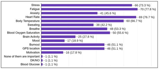 - Which of the following factors do you think would be the most important to monitor while on duty? This question offers up to 15 non-exclusive possible answers (see Figure 13).